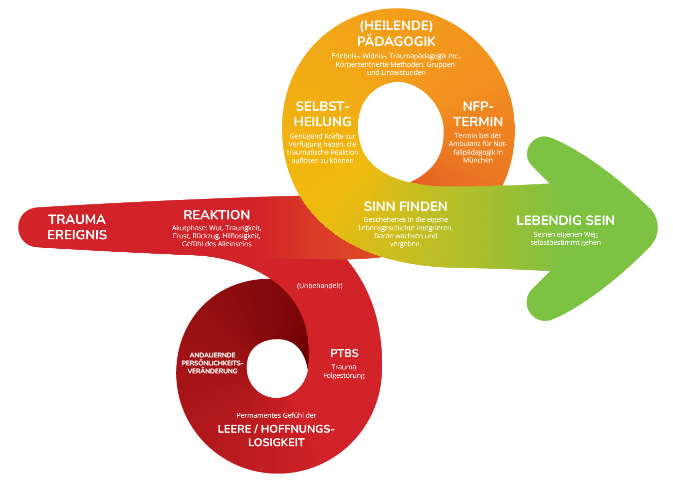 Zur Notfallpädagogik vereinen sich pädagogische Herangehensweisen, die Methoden des Somatic Experiencing und des Embodiment. Damit gelingt es uns behutsam, über Bewegung und neues Erleben, Erstarrtes wieder in Fluss zu bringen. Selbstheilungskräfte, die in jedem Menschen angelegt sind, werden aktiviert. Denken, Sprechen, Fühlen und Handeln kommen wieder in Einklang und ermöglichen eine neue innere Balance. So kann auch Traumatisches in die eigene Lebensgeschichte integriert und zu einer Quelle der Stärke werden.